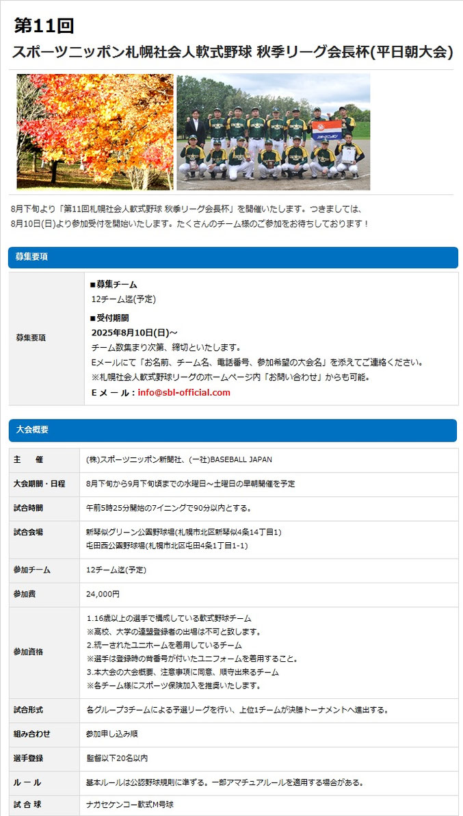 「第11回 秋季リーグ会長杯」参加受付開始のご案内